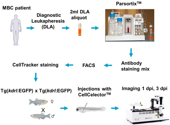 DanioCTC Workflow. A MBC patient undergoes diagnostic leukapheresis (DLA). CTCs are enriched from a DLA aliquot with the Parsortix system and isolated by FACS after staining. Cells are further stained by CellTracker Red for tracking in zebrafish embryos. Single CTCs are isolated by using the CellCelector and injected into 2 dpf old Tg(kdrl:EGFP) zebrafish embryos. Adapted from [27,30].