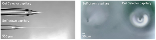 In order to determine the best-suited capillary type for injecting the CTCs into the zebrafish larvae, the commercially available capillary of the CellCelector was compared with other capillaries, which were prepared with a micropipette puller and regularly used for zebrafish injections (Figure 2). The self-prepared capillary was characterized by a long taper and a slightly bigger opening diameter (ca. 25 µm). The original CellCelector capillary, on the other hand, tapered quickly, was therefore rather short and its opening had a diameter of 20 µm. Since more cells stuck in the longer tapered tip of the self-prepared capillary, the use of this capillary type was discontinued and the CellCelector capillary was used. To improve the penetration of the CellCelector capillary into the zebrafish embryo, the tip was broken off with forceps increasing its diameter to approx. 25 µm. An angle of approximately 45° for the capillary opening proved to be the most effective for penetrating zebrafish tissue.