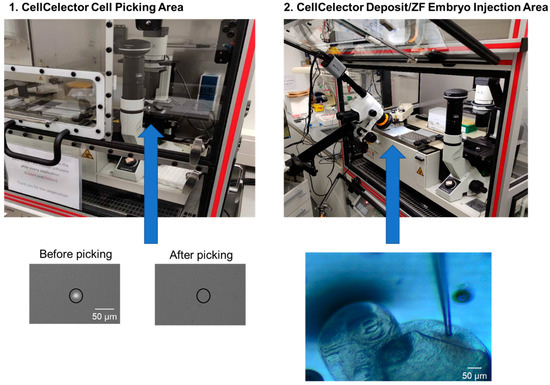 Adapted CellCelector setup. Representative images of the CellCelector picking area of picking a single CellTracker Red-stained CTC and the attached stereomicroscope required for CTC injections in the deposit area of the CellCelector. (1) CellCelector cell picking area and image of region of interest before and after cell picking. (2) CellCelector deposit/zebrafish injection area and brightfield image of embryo being injected.