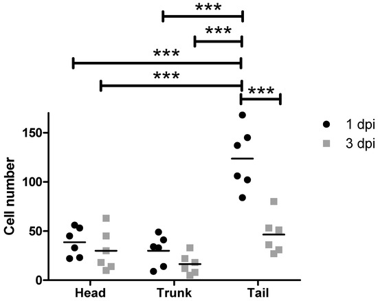 Dissemination of MDA-MB-231 cells after injection with the standard workflow into zebrafish larvae. Depicted are the absolute MDA-MB-231 cell numbers in the head, trunk and tail at 1 and 3 dpi (n = 6). dpi: days post injection. ANOVA followed by post hoc Bonferroni test, *** 0.0001 < p < 0.001.