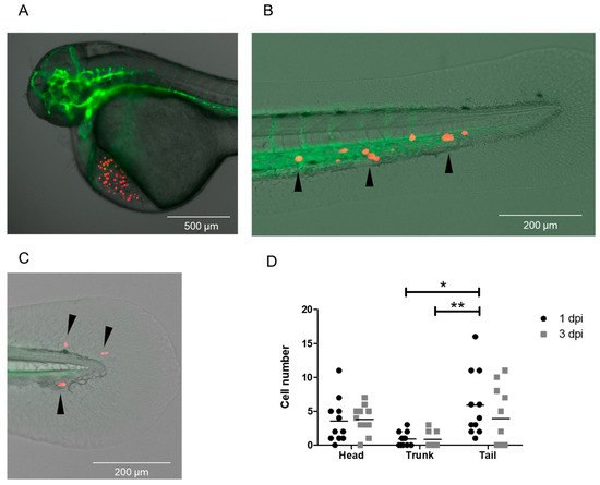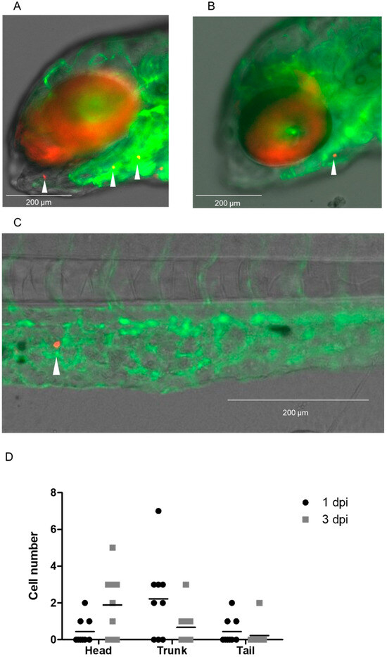 In our experiments, we used the standard workflow to inject EGFP-labeled MDA-MB-231 cells into 2-day-old zebrafish embryos. The injected cells dispersed into various areas of the zebrafish embryos, including the head, trunk, and tail, which contains the caudal hematopoietic tissue (CHT), the site of blood formation at this larval stage (Figure 4). At 1 dpi, an average of 38.6 ± 14.8 cells disseminated into the head region, 30 ± 15.5 cells into the trunk region, and 123 ± 31.4 cells into the tail region. However, by 3 dpi, only 30 ± 20.5 cells were located in the head, 16.3 ± 10.2 cells in the trunk, and 46.3 ± 19.5 cells in the tail. This suggests that approximately 50% of the injected cells died and disappeared between 1 and 3 dpi, with more cells getting lost in the trunk and tail regions compared to the head region. Relative cell numbers can be found in Figure S2.