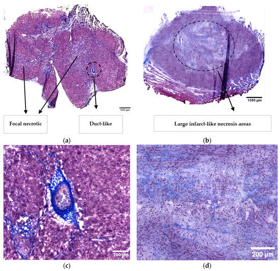Representative Masson trichrome (MT) images of the orthotopic (a) and subcutaneous (b) KPC tumours. Collagen is stained in blue. The scale bar represents 1000 μm. Zoomed-in views of the circular areas outlined by dotted lines are shown in panels (c,d), highlighting a duct-like structure (c) and a large infarct-like necrotic region (d). The scale bar represents 200 μm.