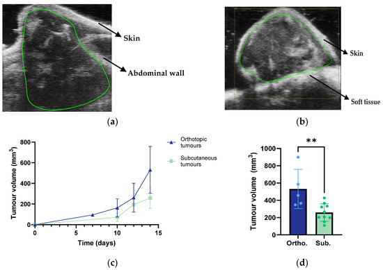 Representative B-mode images and regions of interest (ROI) of the orthotopic (a) and subcutaneous (b) KPC tumours. Growth curves of the orthotopic and subcutaneous KPC tumours (c). Tumour volume 14 days after implantation (d). Each dot represents one tumour. The error bars indicate the SD. The asterisks indicate a statistically significant difference evaluated by a two-tailed t-test. (** p < 0.005). The sample size was n = 5 for the orthotopic tumours and n = 10 for the subcutaneous group.