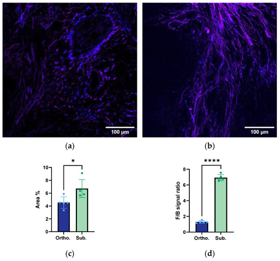 Representative second-harmonic imaging microscopy (SHIM) images of the orthotopic (a) and subcutaneous (b) KPC tumours. Blue represents the forward second-harmonic generation (SHG) collagen signal and magenta represents the matching backward signal. The scale bar represents 100 μm. The quantitative analysis of the collagen fibres imaged using SHIM of the orthotopic and subcutaneous KPC tumours (c,d). The total amount of the SHG signal (c), with a p-value of 0.0186 and the forward/backwards (F/B)-intensity ratio (d), with a p-value below 0.0001. Each dot represents one tumour. The height of the bar is the mean, and the error bar represents the SD. The asterisks indicate statistically significant differences evaluated by a two-tailed t-test. The sample size was n = 5 for the orthotopic tumours and n = 5 for the subcutaneous group. * p < 0.005, **** p < 0.0001.