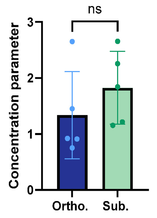 Distribution of the average concentration parameter for the orthotropic and subcutaneous tumours. The height of the bar is the mean, and the error bar represents the SD. Each dot represents one tumour. The sample size was n = 5 for the orthotopic tumours and n = 5 for the subcutaneous tumours.