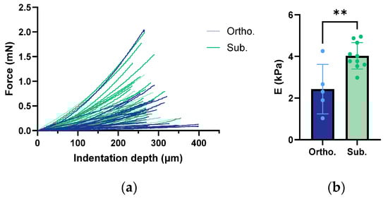 Indentation curves of the orthotopic and subcutaneous tumours. Each line represents one tumour (a). Young’s modulus (E) of the orthotopic and subcutaneous tumours was estimated (b). Each dot represents one tumour and an average of four to five measurements per tumour. The height of the bar is the mean, and the error bar represents the SD. The asterisks indicate statistically significant differences evaluated by a two-tailed t-test. (** p < 0.01). The sample size was n = 5 for the orthotopic tumours and n = 10 for the subcutaneous group.
