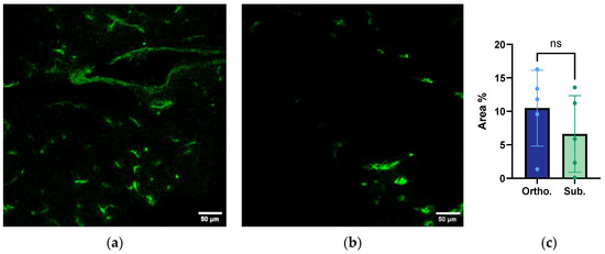 The CLSM images of the functional vessels (lectin-FITC-labelled vessels) of the orthotopic and subcutaneous tumours are presented in Figure 6a,b. A quantitative analysis of the number of fluorescent pixels showed a trend towards a higher number of functional vessels in the orthotopic tumours compared to the subcutaneous tumours (Figure 6c). However, this difference was not statistically significant. Notably, there was substantial variability in the number of functional vessels. This was clearly seen in the additional images presented in Supplementary Figure S4.