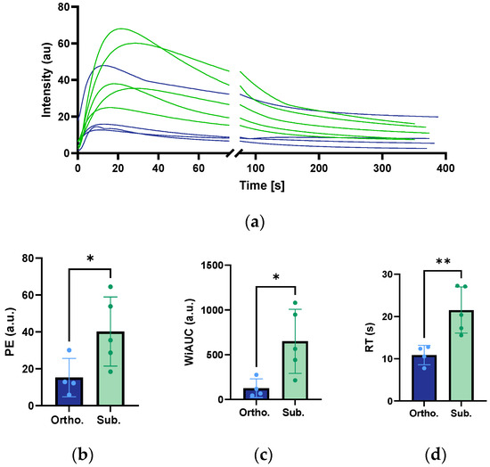 Time–intensity curves (a) of the orthotopic and subcutaneous KPC tumours. The orthotopic tumours are in blue, and the subcutaneous tumours are in green. Each line corresponds to one tumour. The sample size was n = 5 for the orthotopic tumours and n = 10 for the subcutaneous group. The peak enhancement (PE) of the orthotopic and subcutaneous KPC tumours is shown in (b) the wash-in area under the curve (WiAUC) in (c), and the rise time (RT) in (d). Each dot represents one tumour. The height of the bar is the mean, and the error bar represents the SD. The asterisks indicate statistically significant differences evaluated by a two-tailed t-test. (* p < 0.05, ** p < 0,01).