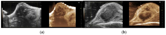 The B-mode ultrasound images and the maximum intensity projection (MIP) of the nonlinear contrast mode images of the orthotopic and subcutaneous tumours are presented in Figure 8a,b, respectively. A qualitative assessment of the images indicated that there were large dark regions with no signal from the contrast agent in the subcutaneous tumours, which were consistent with the larger necrotic area observed in the HES and MT sections (Figure 1d).