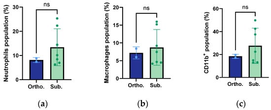 The flow cytometry analysis of the orthotopic and subcutaneous KPC tumours showed that both tumour models exhibited comparable levels of infiltrated macrophages, neutrophils, and innate immune cells (Figure 9). The CD11b-positive cells included neutrophils, monocytes/macrophages, dendritic cells, natural killer cells, and subsets of T and B cells. There was a modest trend towards the subcutaneous tumours having a higher presence of neutrophils, macrophages, and innate immune cells. However, there was no statistically significant difference. There was a large difference in the sample size, with the orthotopic group being substantially smaller than the orthotopic group.