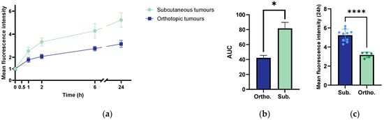 The accumulation of the macromolecule 800CW in the two tumour models was compared. There was a statistically significantly higher accumulation in the subcutaneous model compared to the orthotopic model (Figure 10a–c). The subcutaneous tumours showed a faster accumulation of 800CW, particularly within the initial 2 h, compared to the orthotopic ones.