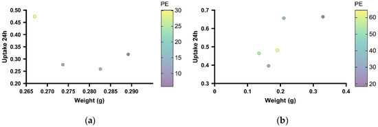 The correlation between the uptake of 800CW 24 h after injection, the PE, and the weight of the orthotopic and subcutaneous KPC tumours (Figure 11) was studied. The multi-variable plot showed that for the orthotopic tumours, the smallest tumour presented the highest 800CW uptake and the highest PE (Figure 11a). However, this was based on only one tumour. A negative correlation between the tumour weight and uptake of CW800, and tumour weight and PE were seen, and the Pearson’s coefficients were, respectively, −0.63 and −0.88. The uptake of CW800 and the PE showed a positive correlation with a Pearson coefficient of 0.84. For the subcutaneous tumours, the larger tumours showed a higher uptake of 800CW (Figure 11b). The Pearson’s coefficient for the tumour weight versus the uptake of CW800 was 0.78. A negative correlation was found between the PE and tumour weight, and the PE and uptake of CW800, with Pearson’s coefficients of −0.64 and −0.45, respectively.