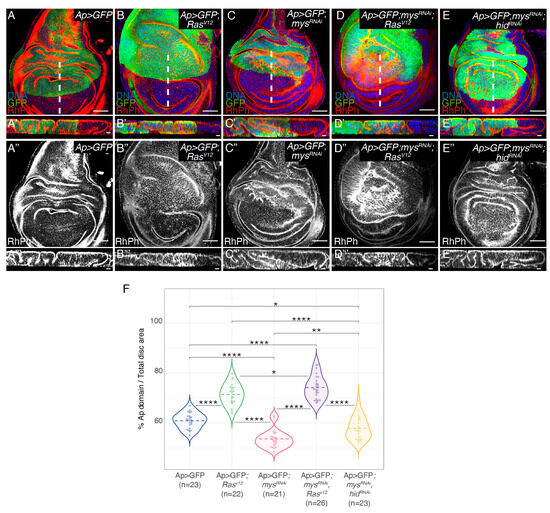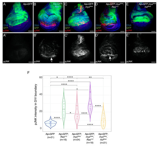 The capacity of RasV12 cells to induce apoptosis of neighbouring wild-type cells has been shown to be mediated by activation of the JNK pathway [36,37]. Accordingly, in a recent study, using an antibody against phosphorylated JNK (pJNK), we detected a clear enrichment of JNK activity in wild-type (GFP negative) ventral cells located at the D/V boundary in Ap>GFP; RasV12 discs [25], Figure 5A–B’,F). We have also shown that JNK mediates apoptosis induced by loss of integrin function [14]. Here, we found that although JNK activity was reduced in the dorsal region of Ap>GFP; RasV12; mysRNAi (Figure 5D,D’,F), compared to Ap>GFP; mysRNAi discs (Figure 5C,C’,F), pJNK levels at the D/V boundary were higher than those found in Ap>GFP; RasV12 discs (Figure 5B,B’,F).