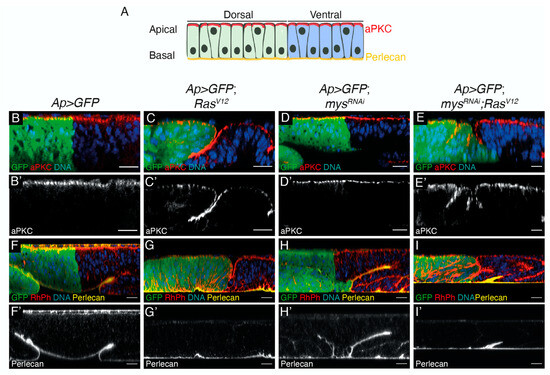 Even though the ectopic expression of RasV12 in wing disc cells alone does not affect cell polarity ([26]; Figure 2A–C’), the loss of polarity genes enhances the RasV12 hyperplastic phenotype [27]. In addition, there is cumulative evidence that integrin-mediated polarity is implicated in cancer (reviewed in [28]). Furthermore, integrin-mediated cell polarity restrains oncogenesis in the fly midgut [29]. Thus, we analysed whether cell polarity was affected in RasV12; mysRNAi disc cells. First, we analysed whether cell polarity was perturbed in the absence of integrins in wing epithelial disc cells and found it was not (Figure 2D,D’). In addition, we found that the downregulation of integrins did not alter the polarity of RasV12 cells (Figure 2E,E’).