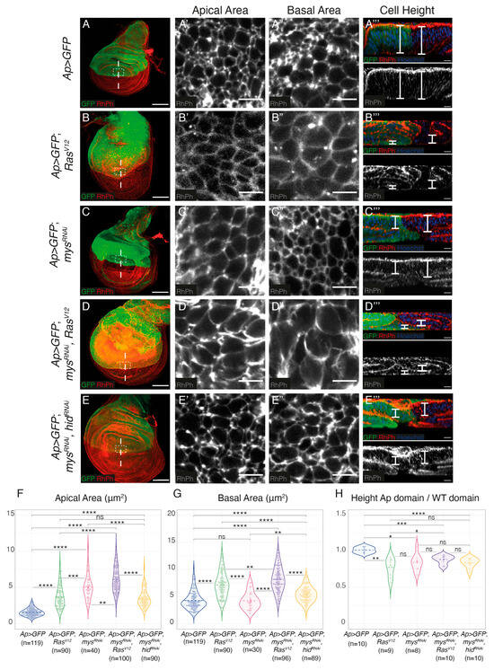 The formation of additional folds could be due to increased cell proliferation, changes in cell shape, cell growth or a combination of these factors. Staining with an antibody against phosphorylated Histone H3 (PH3) showed that, in agreement with previous results [24,25,33,34], the overexpression of RasV12 resulted in a reduction in the number of PH3+ cells (Supplementary Figure S2A–B’,E). This was not affected by the downregulation of integrin expression (Supplementary Figure S2C–E). To analyse possible cell shape changes, cell plasma membranes were visualized using the F-actin marker Rhodamine-Phalloidin (RhPh) (Figure 3). We found that, in agreement with previous results, RasV12 and integrin mutant expressing cells underwent a columnar to cuboidal cell shape change, showing reduced height and increased apical and basal surfaces compared to control cells (Figure 3A–C’’’,F–H) [18,25]. Furthermore, we found that the elimination of integrins exacerbated the cell shape change of RasV12 cells (Figure 3D–D’’’,F–H). Again, this was not just due to the ability of RasV12 to rescue apoptosis of integrin mutant cells, as inhibiting apoptosis in mysRNAi cells does not cause the same shape changes as overexpressing RasV12 (Figure 3E–E’’’,F–H).