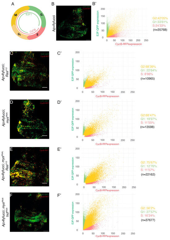 Prolonged expression of RasV12 promotes G1-S phase transition, as a consequence of E2F activation and cyclin E induction [24]. The use of Fly-Fucci, which relies on fluorochrome-tagged degrons from cyclin B -degraded during mitosis- and E2F1 -degraded at the onset of S phase-, verified the role of RasV12 in inducing transition from G1 to S phase and also showed that RasV12 expressing tissues exhibited a reduction of the number of cells in S phase and an accumulation in G2, compared to control tissues [34]. These results are consistent with the previously reported role of RasV12 in promoting cellular growth and senescence in Drosophila imaginal epithelia [24,35]. Using Fly-Fucci, we found that, similar to RasV12 overexpression [34], Figure 4B–C’), downregulation of integrin levels resulted in an increase in the number of cells in G2 (Figure 4D,D’), an increase that did not depend on cell death (Figure 4F,F’). In addition, reducing integrin levels increased the number of RasV12 tumour cells in G2 (Figure 4E,E’).