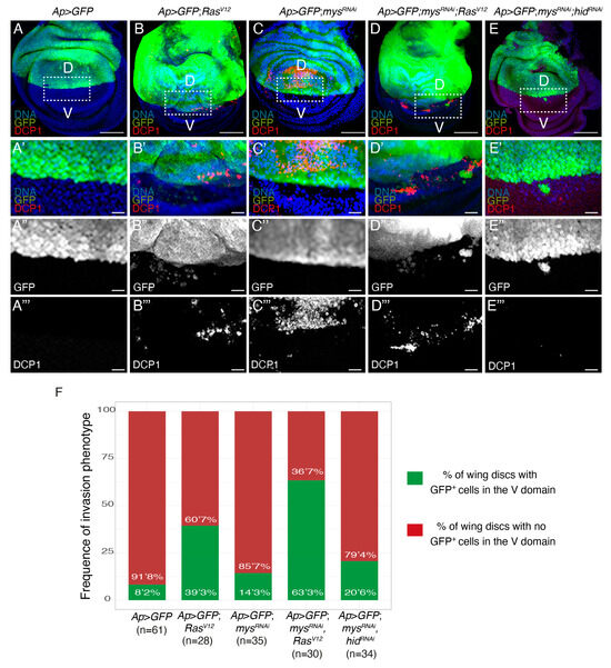 We recently found that a proportion of wing discs expressing GFP and RasV12 in the dorsal domain showed GFP+ RasV12 cells in the ventral domain, some of which were positive for the apoptotic marker cleaved Dcp1 [25]; Figure 6A,B,F). This result led us to suggest that the expression of RasV12 in wing disc cells could induce an invasive behaviour. Here, using the Dcp1 marker to distinguish between dead and alive cells, we found that 39.3% of Ap>GFP; RasV12 wing discs presented alive GFP+ cells in the ventral domain (Figure 6B–B’’’,F), in contrast to the 8.2% found in control wing discs (Figure 6A–A’’’,F). In addition, alive ventral GFP+ cells were only seen in 14.3% of wing discs with reduced integrin levels (Figure 6C–C’’’,F). However, here, we found that reducing integrin function increased up to 63.3% the percentage of RasV12 wing discs showing invading GFP+ cells (Figure 6D–D’’’,F). Once more, this was not just due to the ability of RasV12 to rescue the death of integrin mutant cells, as preventing apoptosis in mysRNAi cells only increased the penetrance of the invasive phenotype up to 20.6% (Figure 6E–E’’’,F).