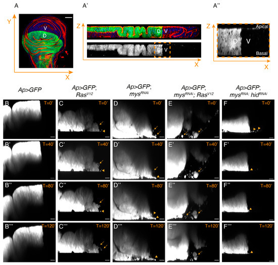 Analysis of the control Ap>GFP wing discs showed that dorsal cells stayed confined within their compartment throughout the incubation period (Figure 7B–B’’’, Movie S1). Conversely, a few GFP+ cells from Ap>GFP; RasV12 wing discs were observed leaving the dorsal compartment and moving into the GFP− ventral compartment (Figure 7C–C’’’, Movie S2). Some of these cells looked smaller and rounder than control cells (arrowheads in 7C–C’’’) and we assumed these were dying cells. This was supported by live imaging analysis of Ap>GFP; mysRNAi wing discs, showing that cells moving out of the ventral domain were also small and round (Figure 7D–D’’’, Movie S3). In contrast, we found that most mysRNAi; RasV12 wing disc cells looked normal and were able to move into the ventral domain further than RasV12 cells (Figure 7E–E’’’, Movie S4). This was not just a consequence of the ability of RasV12 to rescue the death of integrin mutant cells, as only a few small GFP+ cells were found moving into the ventral compartment in mysRNAi; hidRNAi wing discs (Figure 7F–F’’’, Movie S5).