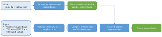 Flowchart demonstrating the tumor segmentation workflow. Input images, automatic processing steps, and manual steps are shown in light blue, blue, and green, respectively. Firstly, automatic prostate localization and segmentation is done using the T2-weighted scan. The user can perform any corrections deemed necessary and finalizes the segmentation. Secondly, the DWI scans are registered to the T2-weighted scan, after which the biparametric combination image is computed. The resulting biparametric combination image is masked with the finalized prostate segmentation. The masked biparametric combination image can then be used to identify and segment tumors.