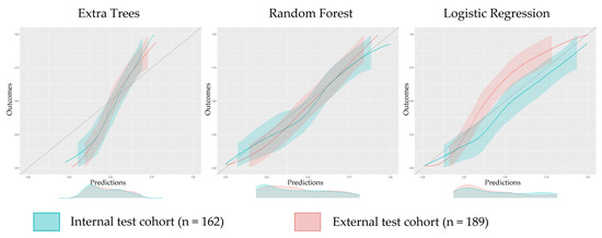 The RF model demonstrated the highest agreement between predicted and observed probabilities of the internal and external test cohorts (Figure 3). The confidence intervals of the internal and external test cohorts showed substantial overlap, indicating comparable calibration performance in both datasets. The LR model demonstrated good calibration for the internal test cohort but showed underestimation beyond a risk threshold of 30%. The ET model exhibited poor calibration in both the internal and external test cohorts.