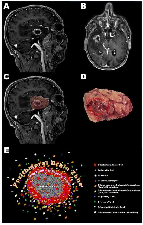 - Giambra, M.; Di Cristofori, A.; Valtorta, S.; Manfrellotti, R.; Bigiogera, V.; Basso, G.; Moresco, R.M.; Giussani, C.; Bentivegna, A. The peritumoral brain zone in glioblastoma: Where we are and where we are going. J. Neurosci. Res. 2023, 101, 199–216. [Google Scholar] [CrossRef] [PubMed]