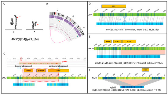 SVs that are undetectable using karyotype analysis. This figure shows four examples of SVs that can disrupt gene function. (A) Karyogram showing an apparently balanced translocation involving chromosomes 2 and 4 with breakpoints estimated at bands 2p23 and 4q24 (red arrows) (B) Optical Genome Mapping also shows the (2;4) (the magenta line connecting chromosomes 2 and 4 on circos plot). (C) However, an evaluation of chromosome 2 breakpoints for this translocation in high resolution shows that they are separated by approximately 500 kilobases, and the intervening sequence is deleted. Blue arrows show the telomeric and centromeric breakpoints. The copy number plot shows a decrease in copy number (red bar), and the region of copy number loss is highlighted by a red box showing the genes that are deleted within this region. Notably, this deletion includes genes of significance in the pathogenesis of hematologic malignancies, like DNMT3A. Below the chromosome 2 reference sequence (green bar), the maps for each translocation are shown (blue bars) that map partially to chromosome 2 (matchlines) versus the part of the map that aligns to chromosome 4 (part with yellow label lines). This deletion is not detected by karyotyping. The genes involved are also unknown. (D) This SV shows an intra-genic inversion within the coding sequence of TET2. This SV likely disrupts TET2 expression and is too small to be seen via karyotype as it is only 38 kb in size. This SV was also not detected using Myeloid NGS panel testing. (E) A 2 Mb deletion involving the 3′ end of the ASXL2 gene on chromosome 20q. This deletion is too small to be seen via karyotype. (F) A one Mb deletion on the X chromosome in a male resulted in the complete deletion of the BCOR gene in 88% of the sample.