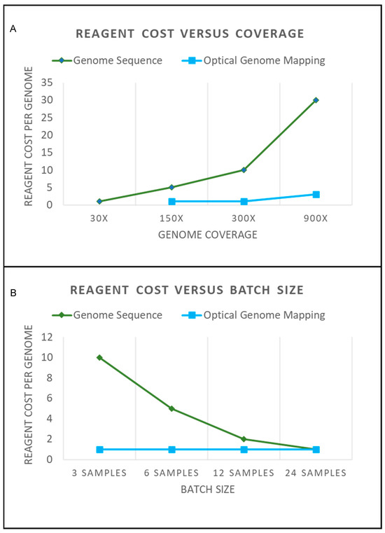 (A) The graph shows a general approximation of reagent costs for genome sequencing and optical genome mapping. A hypothetical reagent cost of “1” is shown for a 30× genome sequence that would be required to perform structural variation analysis. A 30× genome sequence would provide adequate coverage for constitutional SVs present in every cell. Mosaic alterations would require additional coverage for detection. The graph shows that the additional coverage for genome sequencing requires additional sequencing. Achieving an adequate coverage depth with a high probability of detecting low-frequency SV would require a >300× coverage. This significantly increases the cost of performing genome sequencing. Conversely, Optical Genome Mapping can be performed from 150× to >400× coverage on a single flow cell. Obtaining a 900× or greater coverage requires letting the sample run longer on the instrument and may require merging data from multiple flow cells (which would increase reagent cost). (B) Sequencing costs are also affected by batch sizes. To have an optimal turnaround time and sequencing costs, flow cells need to have an adequate number of samples. As can be seen by the graph, as a hypothetical sequencing flow cell reaches capacity, the cost per sample to sequence becomes cost-effective. However, samples that require urgent turnaround times for reporting cannot always be batched effectively. By contrast, OGM can be run with just three samples, and the cost to run does not change. This makes Optical Genome Mapping ideal for small-to-medium size laboratories, and larger throughput instruments are available to increase scalability (also with no change to the reagent cost). Note that no consideration is made for “volume discounting”, which often happens when assays are run at high volumes. This graph is merely illustrative of how the concepts of coverage and batching affect operational costs.
