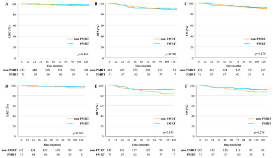 The median follow-up period for the whole study population was 105 months (interquartile range: 85.0–129.8). For the PMRT group, the median follow-up period was 99 months, while that of the non-PMRT group was 109 months before PSM and 116.5 months after PSM, respectively. During the follow-up period, ten (2.0%) patients developed chest wall recurrence: one (0.2%) patient in the PMRT group, and nine (1.8%) patients in the non-PMRT group. Regional recurrence was observed in 11 (2.2%) patients: 1 (0.2%) patient in the PMRT group and 10 (2.0%) patients in the non-PMRT group. The IMNs were the most common site of regional recurrence (n = 5), followed by the supraclavicular LNs (n = 4) and the axillary LNs (n = 4). Before PSM, the 8-year LRC, DFS, and OS rates in the non-PMRT and PMRT groups were 98.5% and 96.5% (p = 0.426), 89.7% and 91.2% (p = 0.700), and 91.5% and 92.1% (p = 0.679), respectively (Figure 1A–C). In the PSM cohort (n = 213), four (5.6%) patients in the non-PMRT group and one (1.4%) patient in the PMRT group had chest wall and regional recurrence. After PSM, the 8-year LRC, DFS, and OS rates in the non-PMRT and PMRT groups were 95.6% and 96.5% (p = 0.365), 84.1% and 91.2% (p = 0.185), and 88.4% and 92.1% (p = 0.276), respectively (Figure 1D–F).
