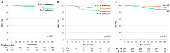 Figure 2 shows that treatment outcomes differed significantly according to the prognostic factors identified by the Cox proportional hazards model. The 8-year LRC rate in the 1–2 LN metastasis group was 97.9%, whereas that in the group with three LN metastases was 90.9% (p = 0.005; Figure 2A). The 8-year DFS rate was also significantly different between the 1–2 LN metastasis group and the group with three LN metastases (91.5% vs. 81.7%, respectively; p = 0.012) (Figure 2B). The 8-year OS rate in patients with LVI was significantly lower than that in patients without LVI (87.8% vs. 96.0%, respectively; p = 0.011) (Figure 2C).