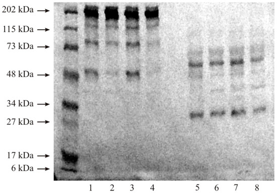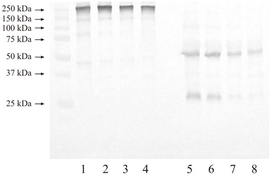 Electrophoretic separation in the presence of disulfide bridge reducing agents (Figure 5, lanes 5–8) resulted in the appearance of only two distinct bands at 55 and 30 kDa. These bands were present in both control samples and in both stages of kidney cancer.