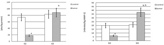 Figure 6 shows the actual and actual specific activity of MMP-2. The actual activity of MMP-2 is expressed in pikokatals per kg of protein content. It was found that in both control samples and G3 tumor tissue, actual activity was similar. Furthermore, only the G2 tumor showed very low MMP-2 actual activity, about 23% of the activity of the respective control samples (p < 0.001). An increase in kidney cancer grade also entailed a considerable increase in the measured activity. There was a significant difference between G3 and G2 (p < 0.001). The MMP-2 activities in both grades of cancer tissue significantly differed. The actual activity of MMP-2 measured in the G3 tumor was over five times higher compared with the G2 tumor. The results for the actual specific activity of MMP-2 are expressed in mikrokatals per kg of enzyme content. Similar actual specific activity, about 20 microkatals per kg of MMP-2, was found in both control samples. The activity of MMP-2 in G2 tumor tissue was significantly lower, almost four times lower in relation to the control samples (p < 0.001). However, the specific activity of MMP-2 in the G3 tumor tissue was extremely high in comparison with the G2 stage of kidney cancer (p < 0.001) (Figure 6).