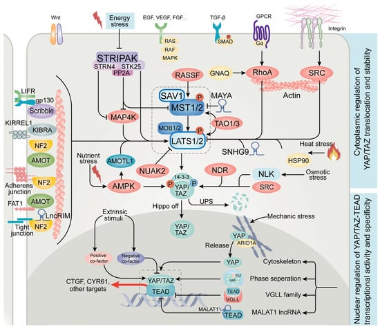 - Kwon, H.; Kim, J.; Jho, E.H. Role of the Hippo pathway and mechanisms for controlling cellular localization of YAP/TAZ. FEBS J. 2022, 289, 5798–5818. [Google Scholar] [CrossRef]