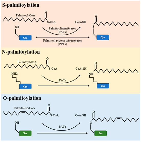 Palmitoylation is a multifaceted post-translational modification, encompassing S-palmitoylation, O-palmitoylation, and N-palmitoylation types. Of these, S-palmitoylation is the most common, involving a reversible covalent bond between the fatty acid palmitate and the thiol group of a cysteine residue within a protein [44]. This form of palmitoylation is dynamic, with its temporal oscillations ranging from mere seconds to several hours, depending on cellular signaling [4]. On the other hand, O-palmitoylation and N-palmitoylation refer to the addition of fatty acyl groups to serine residues and the protein’s amino terminus, respectively, as detailed in Table 2 and illustrated in Figure 1.