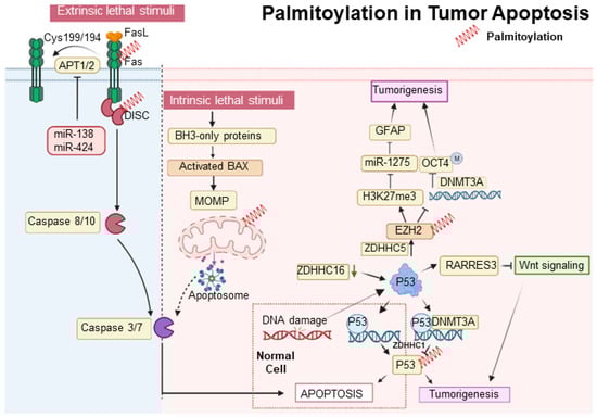 In the intrinsic apoptosis pathway, the tumor suppressor p53 plays a crucial role in halting the cell cycle at the G1/S checkpoint through selective DNA binding in the late G1 phase [82]. Decreased expression of ZDHHC16 in glioblastomas, commonly characterized by EGFR amplification, leads to p53 activation and subsequent cell cycle arrest at the G1/S checkpoint [60,61]. Additionally, p53 promotes gliomagenesis by enhancing the self-renewal and tumorigenic potential of glioma stem-like cells. This is achieved through the upregulation of ZDHHC5 transcription and the modification of EZH2 palmitoylation [52]. ZDHHC5-mediated palmitoylation of EZH2 activates histone H3 Lysine 27 trimethylation (H3K27me3), suppresses miR-1275, elevates Glial Fibrillary Acidic Protein (GFAP) expression, and decreases DNA methyltransferase 3 alpha (DNMT3A) binding to the OCT4 promoter, contributing to glioma malignancy [83]. Furthermore, p53 is palmitoylated by ZDHHC1, which influences DNMT3A’s association with the ZDHHC1 promoter, leading to its hypermethylation and the subsequent inactivation and degradation of non-palmitoylated p53, thus facilitating tumorigenesis [48]. Meanwhile, the SUMOylation of XBP1 is compromised by reduced palmitoylation, diminishing its transcriptional activity and underscoring the role of post-translational modifications in tumor progression [84]. (Figure 1). Contrastingly, the S-palmitoylation of Bcl-2-associated X protein (BAX) at Cys-126, essential for initiating apoptosis, illustrates a divergence in response between normal and cancerous cells, with the former demonstrating a more rapid apoptotic response due to increased BAX S-palmitoylation [85].