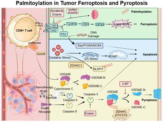 Ferroptosis is a type of cell death characterized by the accumulation of lipid peroxides, with SLC7A11 playing a crucial role in its regulation. This mechanism is particularly relevant in the oncological setting; for instance, in hepatocellular carcinoma, ferroptosis resistance—mediated by lncRNA DUXAP8 and SLC7A11—diminishes the efficacy of treatments such as sorafenib, highlighting the need for novel therapeutic strategies [107,108]. Moreover, complex interactions exist among various cell death pathways, including pyroptosis, ferroptosis, and antitumor immunity. CD8+ T cells, for example, release Granzyme A, which cleaves Gasdermin B and triggers pyroptosis. Concurrently, IFN-γ produced by CD8+ T cells suppresses SLC7A11, leading to lipid ROS accumulation and ferroptosis induction. Palmitoyltransferases ZDHHC 2, 7, 11, and 15 modify GSDME-C at Cys407 and Cys408, facilitating its separation from GSDME-N and enhancing pyroptosis [109]. The suppression of ZDHHC1 through promoter methylation may increase oxidative and ER stress, promoting pyroptosis via the potential substrate NLRP3, thus implicating ZDHHC1 in tumor-suppressive mechanisms [47]. Furthermore, erianin, noted for its anticancer effects against oral squamous cell carcinoma, inhibits cell proliferation both in vitro and in vivo. It induces a G2/M phase arrest, apoptosis, and a novel form of GSDME-mediated pyroptosis, while also affecting autophagy [110] (Figure 4).