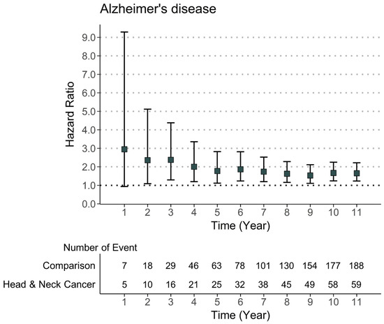 Risk of Alzheimer’s disease in patients with head and neck cancer by the follow-up time.