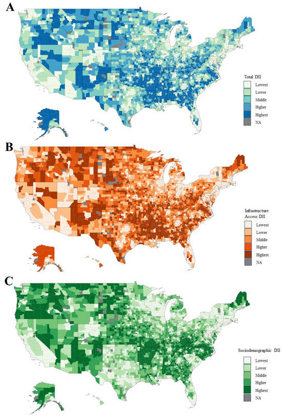 Distribution of total DII ranked scores across the US. Ranked digital inequity scores were assigned per county in the (A) total composite DII, (B) infrastructure access and usage, and (C) sociodemographic categories.