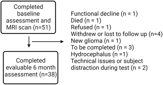 Fifty-one patients with benign or low-grade brain tumors planned to receive partial brain RT, either hypofractionated (>2 Gy/fraction) or conventionally fractionated (1.8–2 Gy/fraction), were recruited at the Wilmot Cancer Institute. The study protocol has previously been published in a separate paper [40], and a manuscript with all primary cognitive outcomes is planned with additional follow-up data from participants in the cohort. Participants underwent evaluations at baseline, 6-month, and 12-month time points, including an ERT through Cambridge Cognition. For this secondary analysis, we focused on 38 patients with baseline and 6-month outcomes on the ERT (Figure 1).