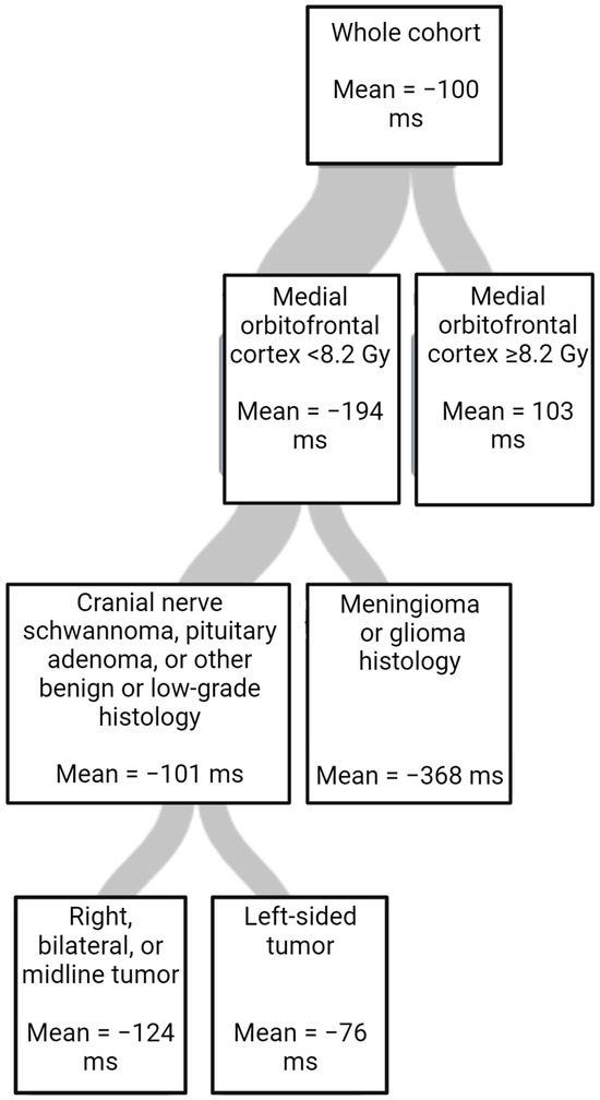 Doses to the amygdala, lateral orbitofrontal cortex, and medial orbitofrontal cortex were highly correlated and could not be examined together in a standard linear regression. For that reason, a random forest regression tree was created using PROC HPSPLIT in SAS 9.4 to model ERTOMDCRT change from baseline to 6 months as a function of tumor histology, tumor laterality, sex, and dosimetric variables, including the highest mean dose to the amygdala, lateral orbitofrontal cortex, and medial orbitofrontal cortex. A regression tree was grown using RSS criterion, cost-complexity pruning, 10-fold cross-validation, and a minimum leaf size of 8. The regression tree and variable importance were then evaluated.