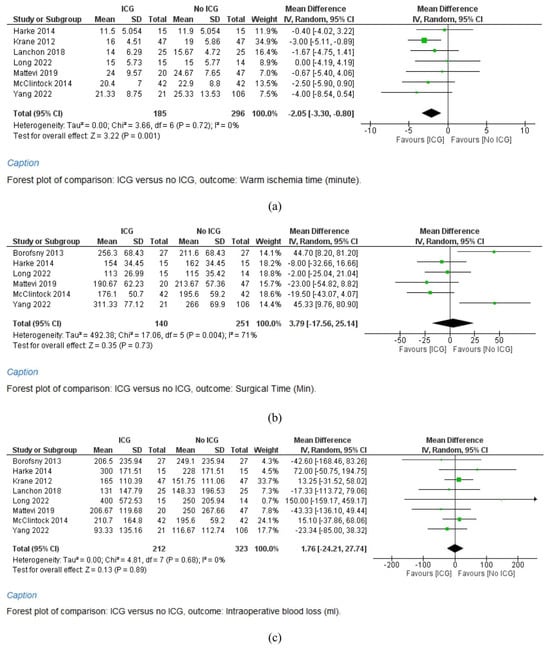 A meta-analysis of seven studies (185 cases in the ICG group and 296 cases in the No ICG group) shows that the warm ischemia time significantly favors the ICG group (WMD = −2.05, 95% CI = −3.30–−0.80, p = 0.011). Study heterogeneity is low (I2 = 51%) (Figure 1a).