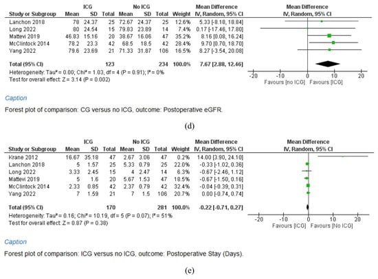 A meta-analysis of five studies (123 cases in the ICG group and 234 cases in the No ICG group) shows that the postoperative eGFR significantly favors the ICG group (WMD = 7.67, 95% CI = 2.88–12.46, p = 0.002). Study heterogeneity is low (I2 = 0%) (Figure 1d).