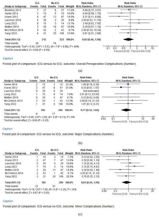 Similarly, a meta-analysis of seven studies (191 cases in the ICG group and 296 cases in the No ICG group) shows that minor perioperative complications show no significant difference between the two groups (RR = 0.81, 95% CI = 0.44–1.50, p = 0.50). Study heterogeneity is low (I2 = 24%) (Figure 2c).