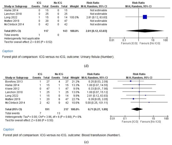 Evaluating the specific postoperative complications, a meta-analysis of five studies (117 cases in the ICG group and 143 cases in the No ICG group) shows that the urinary fistula (UF) rate shows no significant difference between the two groups (RR = 2.85, 95% CI = 0.12–63.83, p = 0.52). Study heterogeneity is not applicable (Figure 2d).