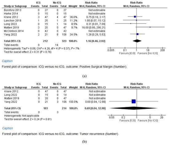 A meta-analysis of eight studies (212 cases in the ICG group and 323 cases in the No ICG group) shows that the positive surgical margins rate shows no significant difference between the two groups (RR = 1.16, 95% CI = 0.46–2.92, p = 0.76). Study heterogeneity is low (I2 = 7%) (Figure 3a).