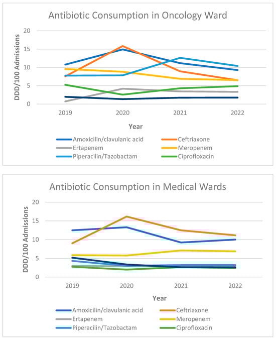 To analyze factors associated with antibiotic resistance, we analyzed the consumption of antibiotics and compared the Oncology Ward (OW) with the Medical Ward (MW). We compared defined daily doses (DDD)/100 admissions in both wards.