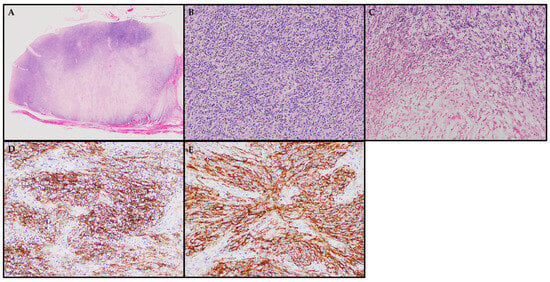 Histologically, as detailed in Table S1, EBV-SMTs share several characteristics with typical leiomyomas. These features include well-defined borders and fascicles of spindle-shaped cells with “cigar-shaped” nuclei andmoderate amount of eosinophilic cytoplasm [22,23,24,25,26,27,28,29,30,31,32,33,34,35,36,37,38,39,40,41,42,43,44,45,46,47,48,49,50,51,52,53,54,55,56,57,58]. In some cases, as reported by Suwan et al., these tumor cells may exhibit epithelioid morphology [49]. Notably, there can be focal areas within EBV-SMTs that display increased nuclear atypia, necrosis, or increased mitotic activity, with up to 20 mitotic figures per 10 high-power fields and a Ki67 proliferative index of up to 24% [23,24,32,35,36,42,43,45,47,51,52,53]. The background stroma can occasionally show collagenous or myxoid changes [23,29,45]. The distinctive characteristics of EBV-SMTs comprise the presence of a second population of small, round tumor cells with hyperchromatic, round nuclei and limited amphophilic cytoplasm, as well as an infiltrate of intratumoral lymphocytes [26,28,29,30,34,36,41,44,45,47,48,50,51,53,55,57]. Other noteworthy features may include increased vascularity resembling hemangiopericytoma (HPC)-like vasculature or an appearance reminiscent of an inflammatory pseudotumor (IPT) [27,28,29,34,53]. Visual representations of the key histological features described earlier are also presented in an illustrative case of a lymph node involved with an EBV-SMT (see Figure 2).