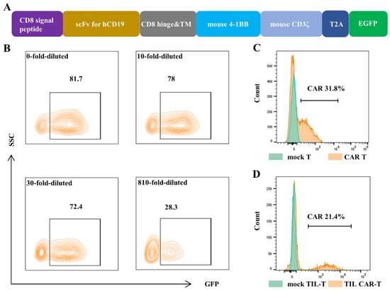 Construction of CAR T cells. The MSCV-CD19-BBζ CAR retrovirus was packed, and then it infected NIH/3T3 cells, splenic T cells, and TIL-Ts separately. The expression of GFP and CAR was detected by FACS. (A) Gene structure diagram of cd19-bbζ car-egfp. (B) The expression of GFP in NIH/3T3 cells, which were infected with different dilution concentrations of virus supernatant. (C) The expression of CAR in the splenic T cells after virus infection. (D) The expression of CAR in the tumor-derived T cells (TIL-Ts) after virus infection.