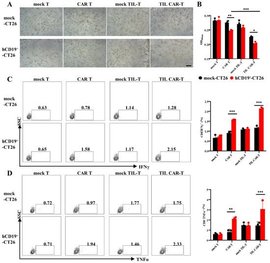 T cells play a cytotoxic role partly through the secretion of IFN and TNFα. Therefore, the expression of IFNγ and TNFαs in T cells were detected by FACS. As shown in Figure 2C,D, the expression of IFNγ in CAR T or TIL CAR-T co-cultured with the hCD19+-CT26 groups was 1.57 ± 0.02% and 2.14 ± 0.07%, while the expression of TNFα was 2.12 ± 0.17% and 3.09 ± 0.82%, respectively; these expression values were significantly higher than that of the other groups. For mock TIL-T, there was no significant difference in IFNγ and TNFα between mock-CT26 and hCD19+-CT26, but the killing ability was slightly stronger than the mock T group. These results demonstrated that both CAR T and TIL CAR-T cells could effectively kill the CD19+-targeted cells, but TIL CAR-T performed better, which might be a tonic role of tumor antigen-specific TCR.
