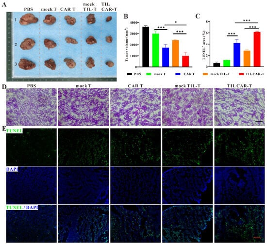 TIL CAR-T inhibited tumor growth. (A) Representative gross view of tumor in tumor-bearing mice. (B) Statistical graph of tumor size. (C) Quantification of TUNEL staining. (D) H&E staining of tumor tissues. (E) TUNEL (green) and DAPI (blue) fluorescent staining of tumor sections (scale bar = 200 μm, n = 3, * p < 0.05; *** p < 0.001).