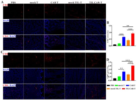 TIL CAR-T promoted immune cell infiltration in the tumor tissues. (A) Representative images of CD4 (red) and DAPI (blue) fluorescence staining. (B) Quantitative CD4 fluorescence staining area of tumors. (C) Representative images of CD8 (red) and DAPI (blue) fluorescence staining. (D) Quantitative CD8 fluorescence staining area of tumors (scale bar = 200 μm, n = 3, ** p < 0.01; *** p < 0.001).